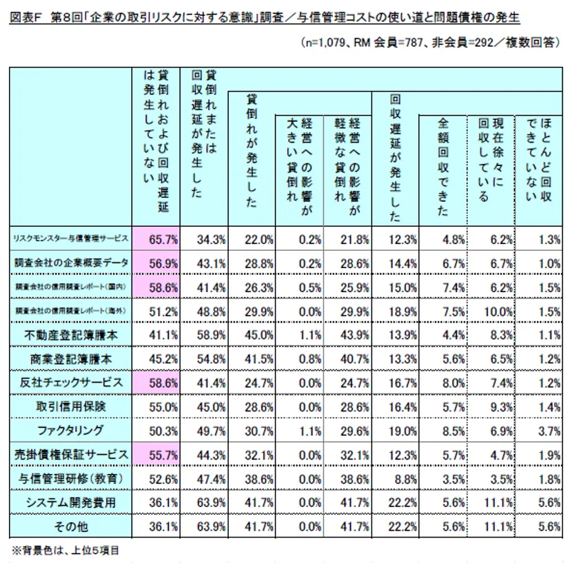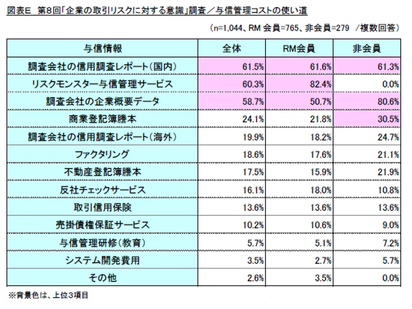直近1年間の与信管理コストの使い道を調査したところ、最も回答率が高かったのは、RM会員では「リスクモンスター与信管理サービス」(回答率82.4%)、非会員では「調査会社の企業概要データ」(同80.6%)となっており、RM会員においては、リスモンサービスを与信管理の主軸として活用していることがうかがえます。