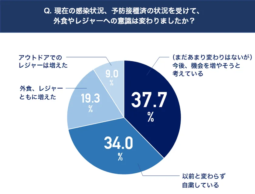 (まだあまり変わりはないが)今後、機会を増やそうと考えている 37.7%、以前と変わらず自粛している 34.0%、外食、レジャーともに増えた 19.3%、アウトドアでのレジャーは増えた 9.0%