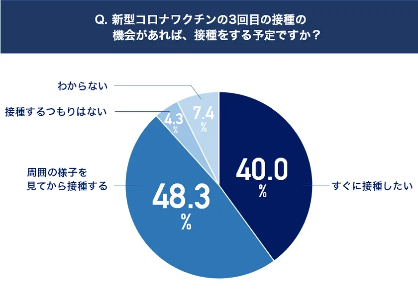 すぐに接種したい 40.0%、周囲の様子を見てから接種する 48.3%、接種するつもりはない 4.3%、わからない 7.4%