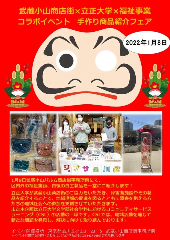 株式会社デザインマインドカンパニー(所在地:東京都品川区、代表:松田 一樹)と立正大学(東京都品川区)は、武蔵小山商店街振興組合(東京都品川区)の事務所前にて、品川区内外の福祉施設で作られている自主製品を一堂に紹介するイベントを、2022年1月8日(土)に開催いたします。