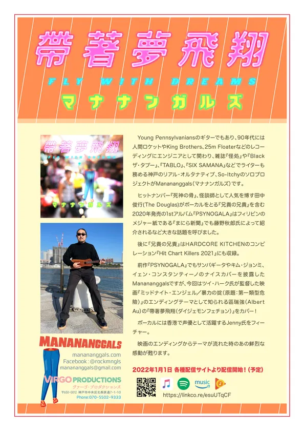デジタルコンテンツを制作するVirgo Productions(所在地:神戸市中央区、代表:横山創一)は、Manananggals(マナナンガルズ)の『帯著夢飛翔』を2022年1月1日(土曜日)よりApple Music、Spotify、Amazon Musicなど各種配信サイトにて配信開始いたします。