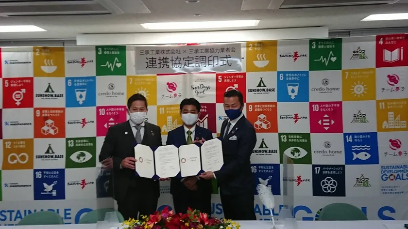これら目標を実現していくためには、三承工業協力業者会と一体となり、地域に必要とされる組織であり続け、今まで以上に連帯感のある活動を行っていく必要があると位置づけ、互いが公平な立場で事業を構築する組織を確立していくこと、また社会的・経済的価値を創造する企業として、切磋琢磨しそれぞれの成長発展につなげていくことを固く誓い、連携協定調印式を行いました。