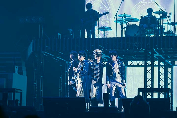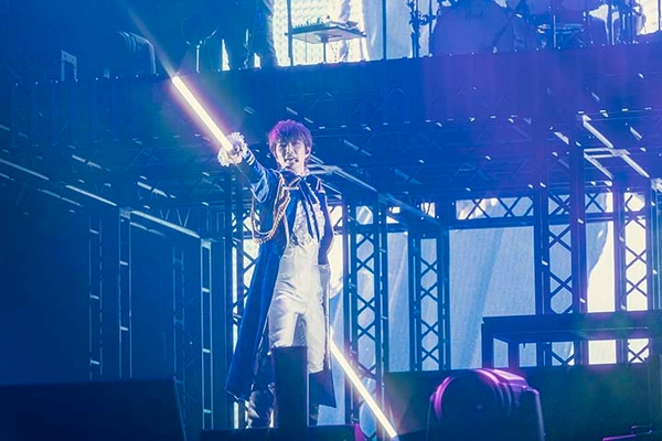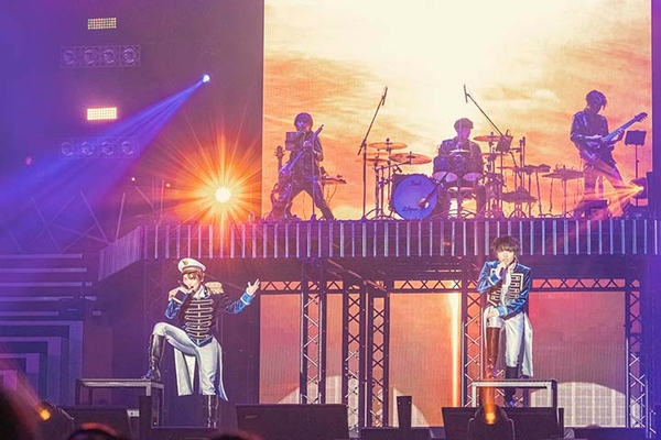 かくして宴の幕は開けた。清らかなる青の歌声で、囚われた心を未来へと解き放っていくO★Zの「残酷シャングリラ」。旋律にすら縛られない破天荒さで、道を切り拓くLOS†EDENの赤き「BLOODY KISS」。ECLIPSEは「玉座のGEMINI」で、荘厳なシンフォニーロックを響かせ、神聖不可侵なる天上の白へと染める。作中にも登場した剣型マイクを手にした3ユニットの個性が炸裂し、一斉に色を変えていくペンライトの光景も感動も呼んだ。