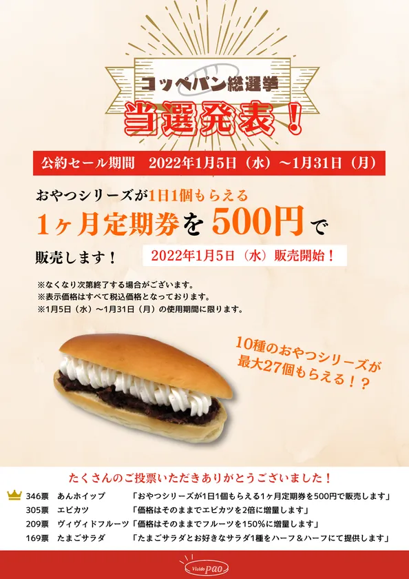 株式会社プラウド(本社:静岡県三島市、代表取締役:富田 久由)が運営する「コッペパン専門店 ヴィヴィド・パオ」は、合計31種以上のコッペパンからお客様が選ぶコッペパン総選挙を実施し。総数1,000票を超えるお客様の投票により、おやつシリーズからあんホイップ「おやつシリーズが1日1個もらえる1ヶ月定期券を500円で販売します」が1位に当選しました。