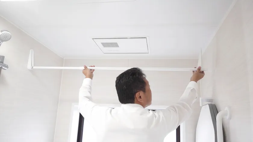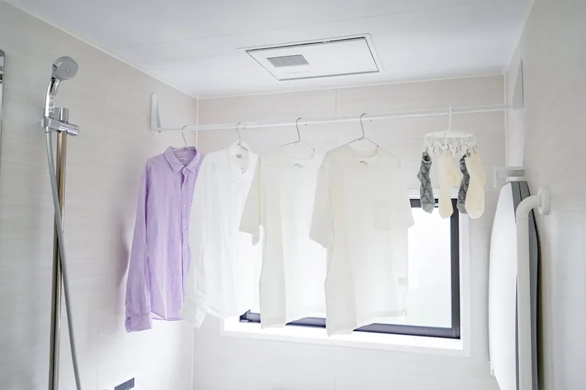 室内物干の不満は物干しスペースを浴室に移動させることでスッキリ解決。スペース不足、気になるニオイ問題、露骨な生活感が気になる見た目、全て解決できます。