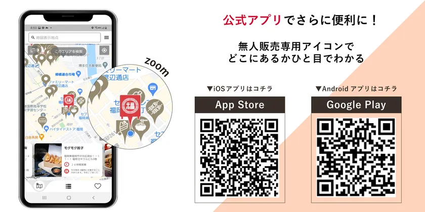 アプリのマップ上には、自動販売機型のピンで表示され、ひと目で他の固定店舗、移動販売店舗との差別化ができます。