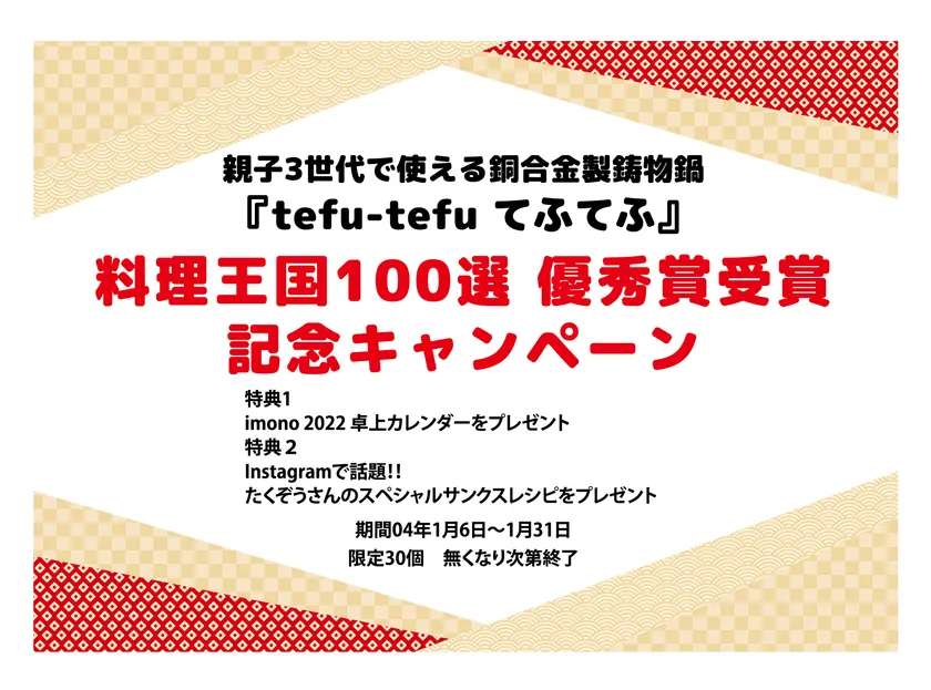 「食の逸品コンクール料理王国100選」優秀賞受賞を記念して1月6日より、『親子3世代で使える銅合金製鋳物鍋 tefu-tefu てふてふ 料理王国100選優秀賞受賞記念キャンペーン』を開催いたします。ご購入の特典としてimono2022卓上カレンダーとInstagramで話題、たくぞうさんのスペシャルサンクスレシピをセットにしてプレゼント(限定30個)。