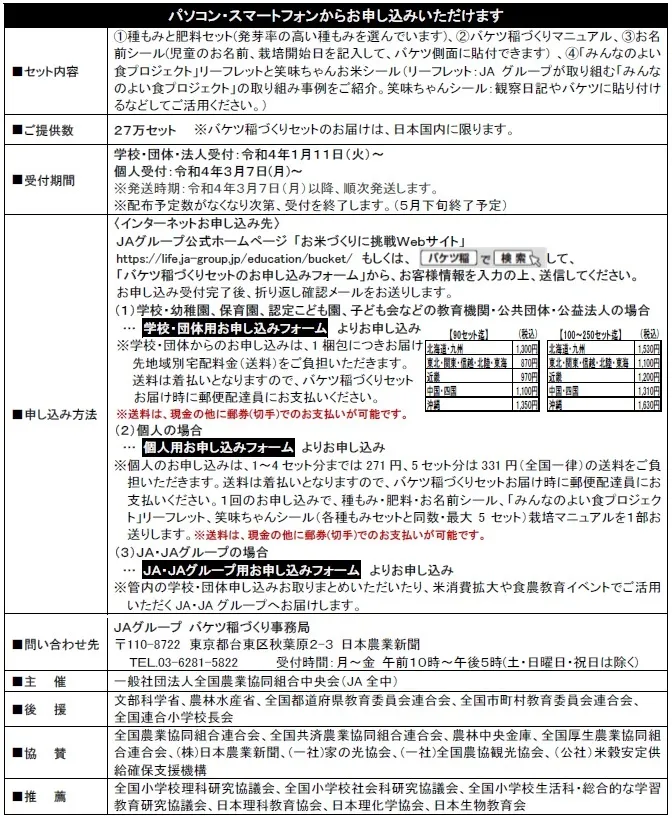 JAグループでは「みんなのよい食プロジェクト」の一環として、次代を担う子どもたちに、日本の主食であるお米や、農業への関心と理解を深めてもらえるよう、バケツを使って手軽にお米づくりが体験できる「バケツ稲づくり」事業を令和4年度も実施いたします。