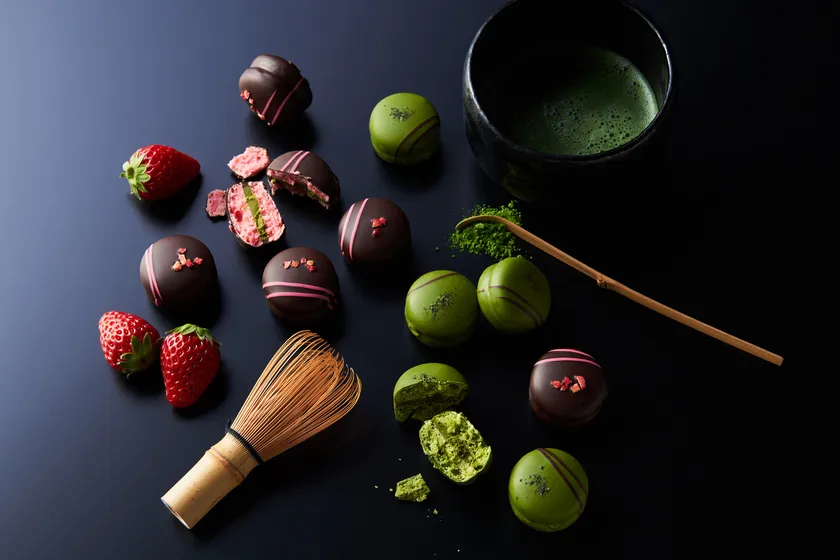 2022年最初の新作スイーツは、こだわりのガナッシュをサンドし、チョコレートをコーティングして仕上げた、ケーキのような「ショコラマカロン」。抹茶のマカロン生地に濃厚な抹茶ガナッシュをサンドし、全体を抹茶チョコレートでコーティングした抹茶づくしの“抹茶&抹茶”と、ピンクが鮮やかないちごのマカロン生地にいちごを加えた抹茶ガナッシュをサンドし、ビターチョコレートで全体をコーティングした“抹茶&いちご”、2種類のフレーバーをご用意しました。抹茶やいちごとの相性を考え、チョコレートはベルギー産と国産をブレンド。それぞれの味を引き立たせるため、抹茶にはホワイトチョコレートを、いちごにはビターチョコレートを合わせています。チョコレートのパリッとした食感に、サクッとほどけるマカロン生地、柔らかなガナッシュの口どけが絶妙な、2022年新作バレンタインギフトです。