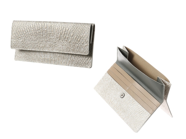 ヒロコ ハヤシの定番「DAMSCO(ダマスコ)」シリーズからも、長財布スリム、ミニ財布スリムがデビュー。箔を貼った牛革に織物風の型押しを施し、最後にアンティーク風に仕上げています。内側の配色もポイントです。
