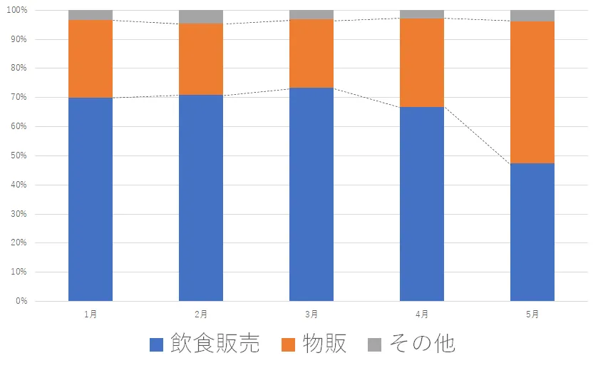 25%前後で推移していた「物販」の割合が4月に微増し、5月に入って急増します。