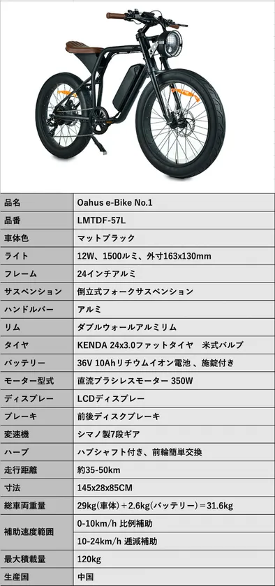 内容:Oahus電動アシスト自転車×1台