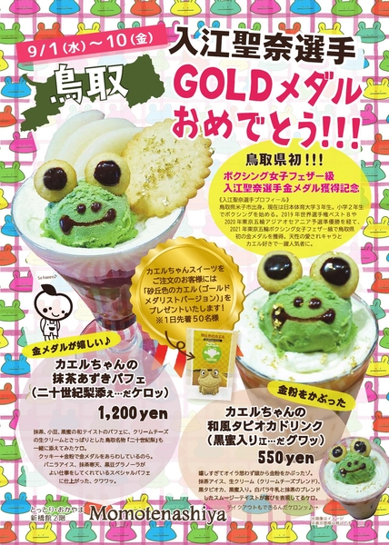 東京オリンピック2020において、ボクシング女子フェザー級の入江聖奈選手が鳥取県勢として初となる金メダルを獲得しました!とっとり・おかやま新橋館では、入江選手の金メダル獲得を記念して、入江選手が大好きなカエルにちなんだイベントを開催します!皆様もぜひ、入江選手の金メダル獲得を一緒にお祝いしましょう♪