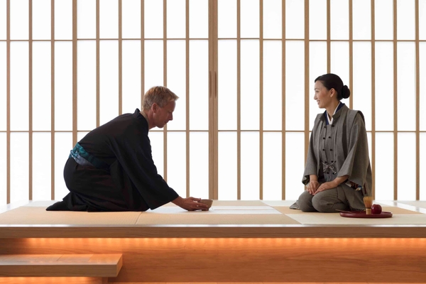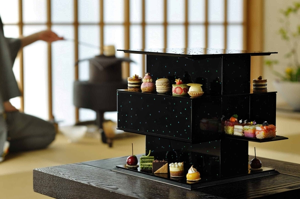 星のや東京の畳の間で、スタッフが茶事の流れに合わせて、飲み物を提供します。また、アフタヌーンティーの器は、古代の日本建築を知るうえでも重要な遺品である法隆寺の玉虫厨子をイメージして作成した、星のや東京にしかないオリジナルのお重です。お重は、江戸時代の頃から宴席での肴を盛る器として使われていました。