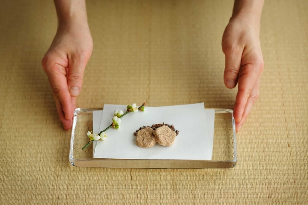 茶事とは、茶の湯において懐石、濃茶、薄茶をもてなす正式な茶会のことです。星のや東京では、この茶事になぞらえ、茶懐石として点心とお酒、濃茶と主菓子、薄茶と干菓子を「Nippon キュイジーヌ 〜発酵〜」で表現し、提供します。 点心、主菓子、干菓子の一つ一つ、すべてに発酵食品を使用しています。