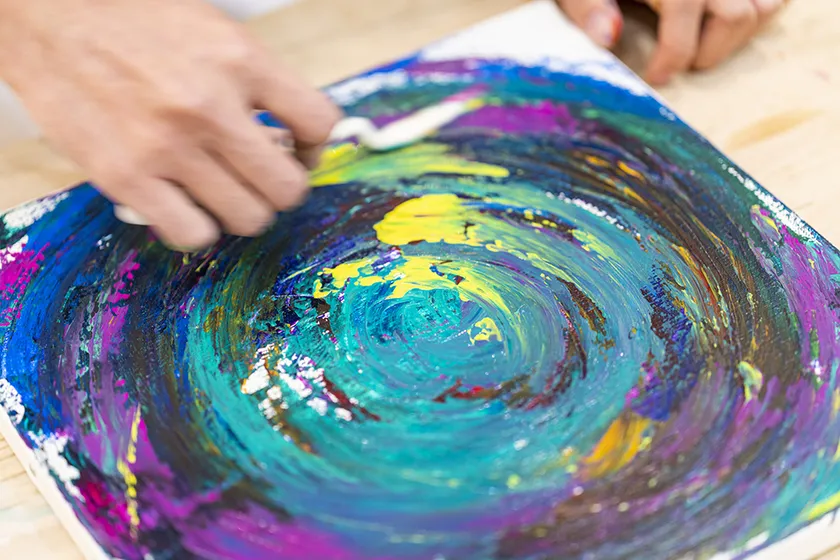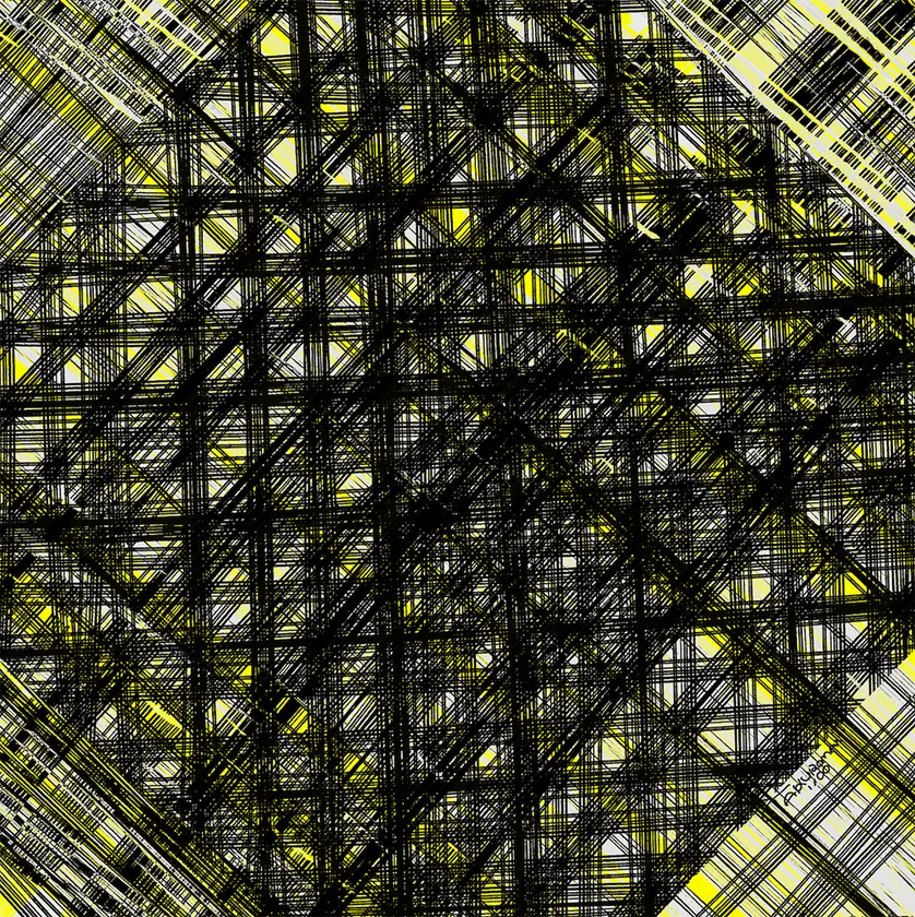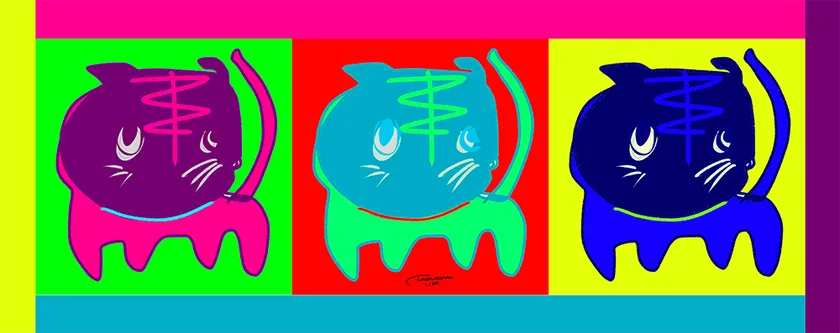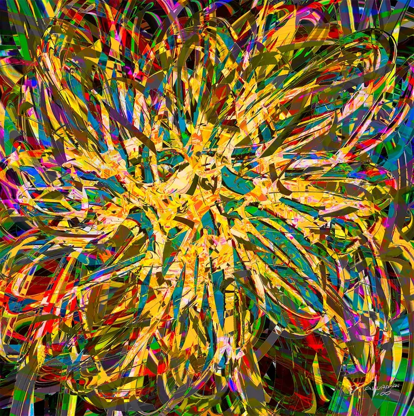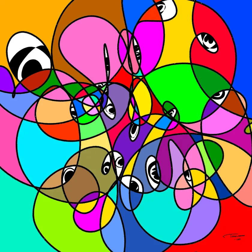ドローイングにより偶然現れた形に直感的な彩色をおこなったものが、ほぼそのままアート作品になる。そのため、同じものを2度と描くことができない。