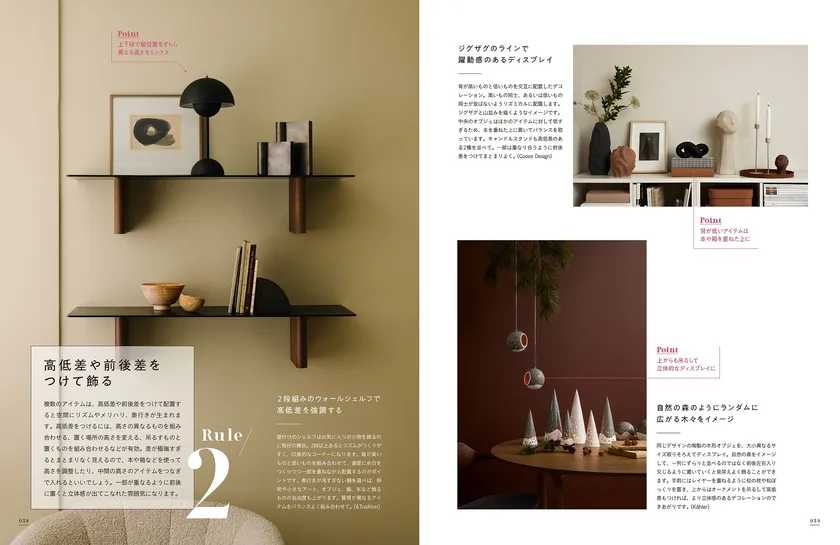 第2章では、30のキーワードと具体的な事例写真で飾り方のルールを解説。プロのインテリアスタイリストが普段感覚で行っているデコレーションテクニックを分かりやすくまとめました。飾り方に行き詰まったときや迷ったときのヒントとしてお役立ていただけます。