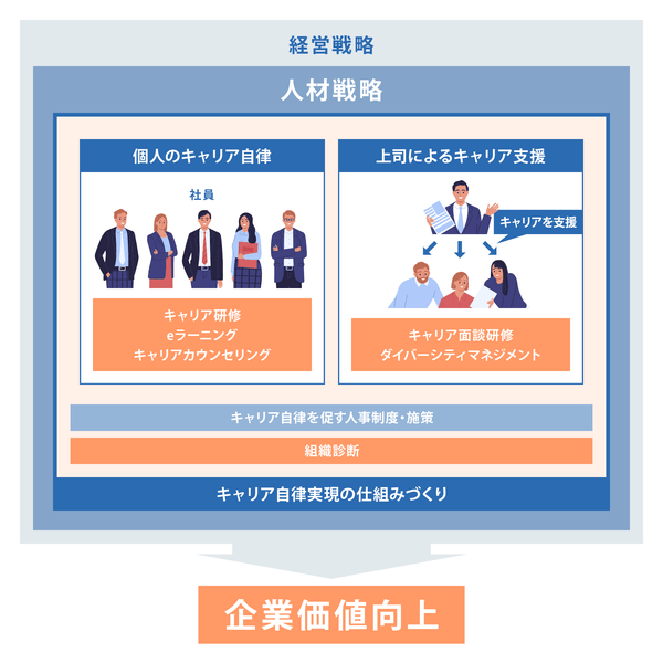 「働きがいを、すべての人に。」をビジョンに、業界のパイオニアとして21年前から企業向けキャリア支援を実施。各年代層向けの研修に留まらず、定年・役職定年という転機への対応、部下のキャリア支援、ダイバーシティ推進など、多様なテーマを切り口とした研修サービスも展開。セルフ・キャリアドックの導入支援や、キャリア自律度合いを可視化するキャリア自律調査など、キャリア支援の仕組みづくりに向けた多彩なソリューションを提供している。年間約200社の⼤⼿企業を支援する。累計キャリア支援対象者人数16万人。