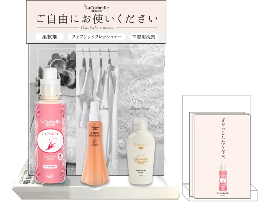 サンプルご利用店では、柔軟剤のほかにラ コルベイユ オーガニックランドリー ファブリックフレッシュナー(693円:税込/200ml)、下着用洗剤ラブリー365(1,320円:税込/110ml)も無料でお試しいただけます。