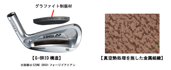 独自開発であるフェース裏内部にグラファイト制振材を複合するG-BRID(グラファイトハイブリッド)構造を採用。振動を抑えるとともに、低重心化を可能としました。さらに真空熱処理製法を用いることで、金属組織の大きさが均一になり、従来の軟鉄を凌ぐ好打感を実現いたしました。