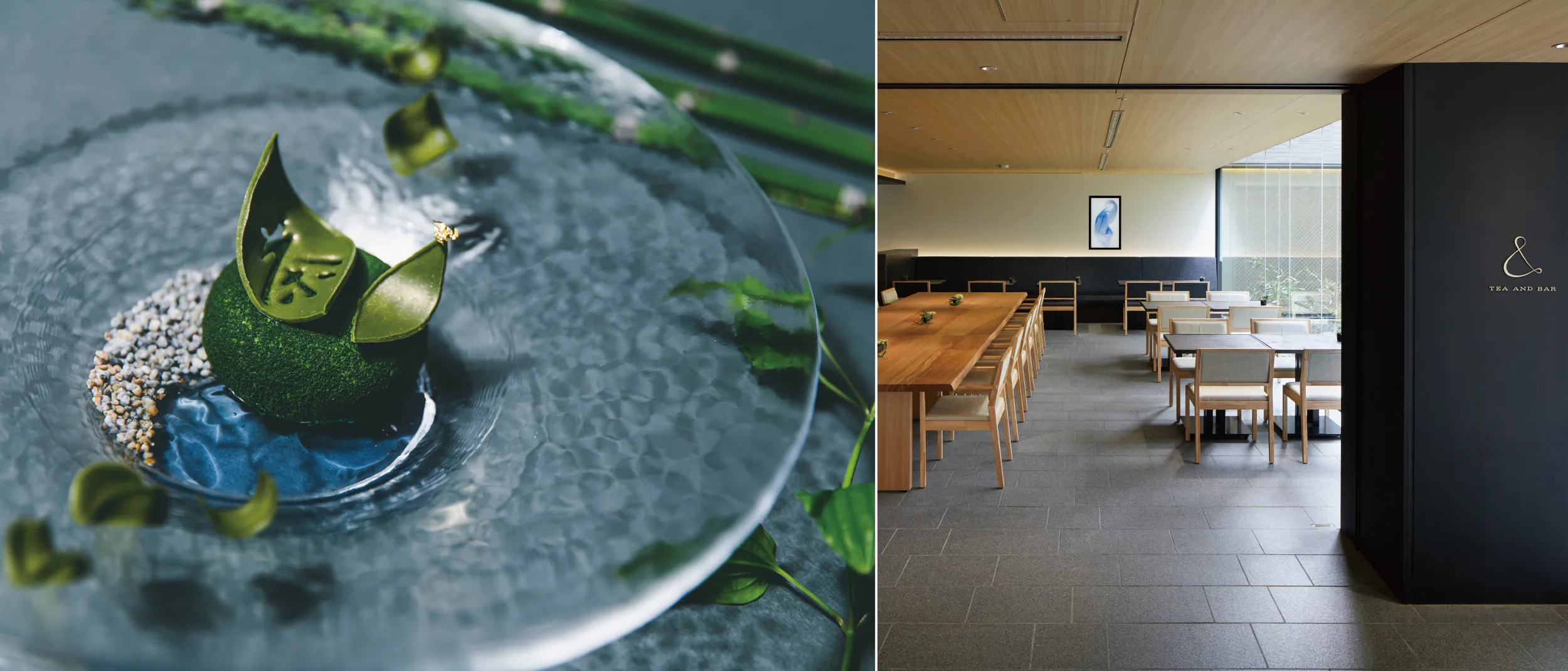 新しく登場するシグネチャースイーツは、苔玉をイメージした濃い緑色の抹茶ケーキ、アーモンドの砂利、鮮やかな青色のバタフライピーのジュレの池で小さな奥庭を表現。ガラスの器に盛りつけることで、テラリウムのような印象を与えます。