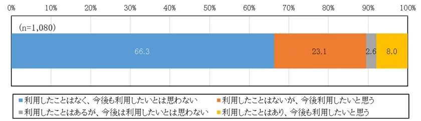 今後の利用意向について、今後利用したいと思うと回答した人の割合は、31.1%となった(「利用したことはないが、今後利用したいと思う」、「利用したことはあり、今後も利用したいと思う」の回答の合計)。