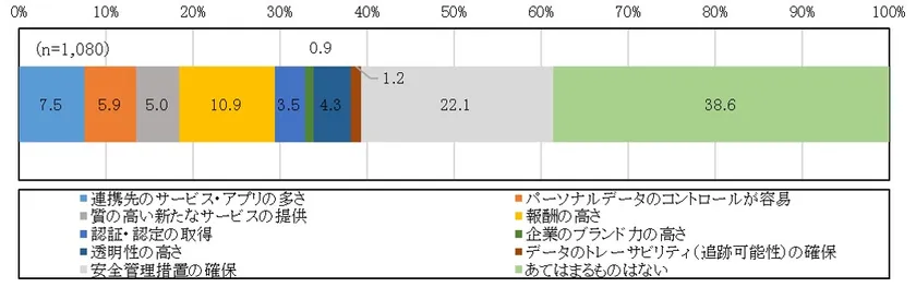 パーソナルデータを活用したサービスを選択する条件について、「安全管理措置の確保」が最も支持された(22.1%)。サービス提供の際には、データ漏えいなどの防止策や、問題が発生した際の対応策や責任を明確にするなどの、利用者が安全性を感じることができる措置を講じることが利用を促すためのポイントとなる。