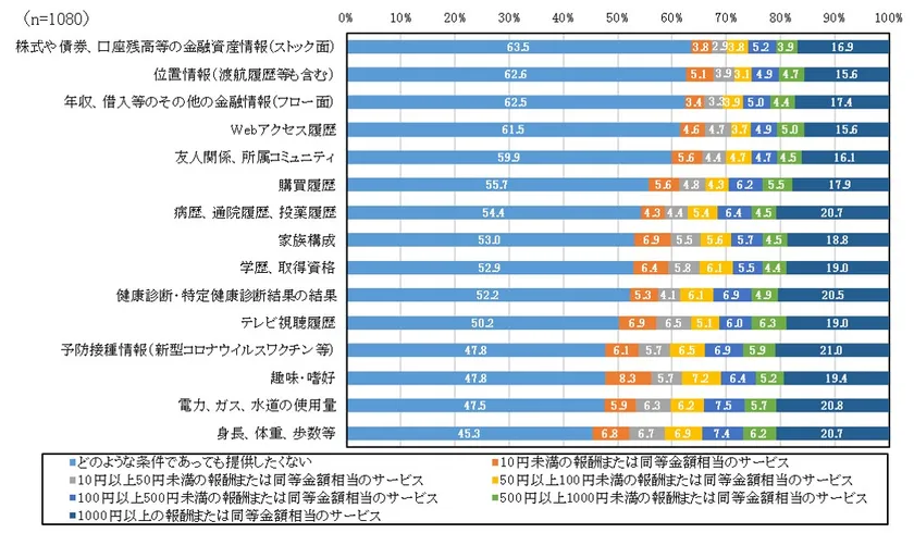 「どのような条件であっても企業に提供したくない」と回答したパーソナルデータについて、「株式や債券、口座残高等の金融資産情報(ストック)」は63.5%、「位置情報」は62.6%、「年収、借入等のその他の金融情報(フロー面)」は62.5%、「Webアクセス履歴」は61.5%と、60%以上の回答が集まった。一方で、「予防接種情報(新型コロナウイルスワクチン等)」、「趣味・嗜好」、「電力、ガス、水道の使用量」、「身長、体重、歩数等」については、「どのような条件であっても企業に提供したくない」との回答は50%未満にとどまり、金銭やポイント等の対価を得る条件でパーソナルデータを企業に提供しても良いとの回答が多かった。