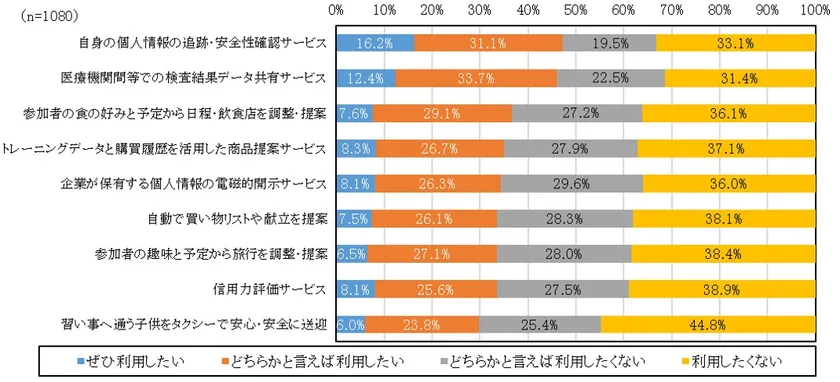 パーソナルデータを活用したサービスについて、「自身の個人情報の追跡・安全性確認サービス」、「医療機関間等での検査結果データ共有サービス」、「信用力評価サービス」、「企業が保有する個人情報の電磁的開示サービス」、「参加者の趣味と予定から旅行を調整・提案」、「参加者の食の好みと予定から日程・飲食店を調整・提案」、「自動で買い物リストや献立を提案」、「トレーニングデータと購買履歴を活用した商品提案サービス」、「習い事へ通う子供をタクシーで安心・安全に送迎するサービス」の利用ニーズを調査した。