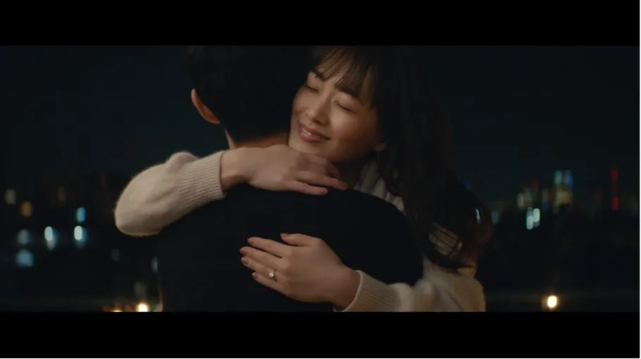 あくる日の晩、バルコニーでくつろぎのひと時。都会の夜景に婚約指輪をかざして、うっとり見とれながら昨日のプロポーズを思い返す。夜景と夜空の星の光がより一層ダイヤモンドを美しく輝かせ、「これが夢じゃなかったら、幸せ者だね、私。」と心の中でつぶやきながら幸せをかみしめている。