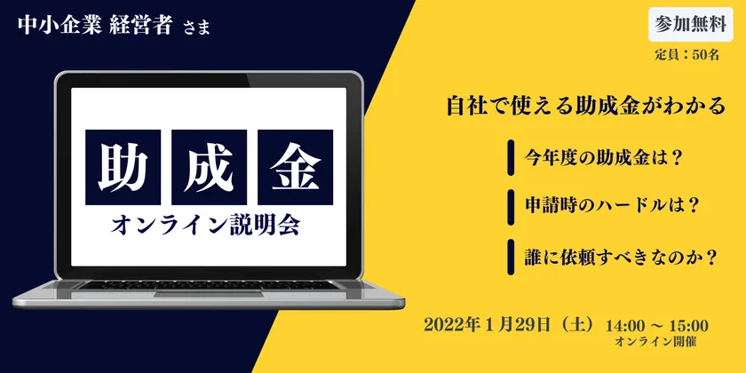 株式会社OBSメディア21(本社:大分県大分市、代表:黒田 隆司)は、株式会社ライトアップ(本社:東京都渋谷区、代表:白石 崇)と共催し、2022年1月29日(土)に、「経営者のための助成金活用オンライン説明会」を開催します。