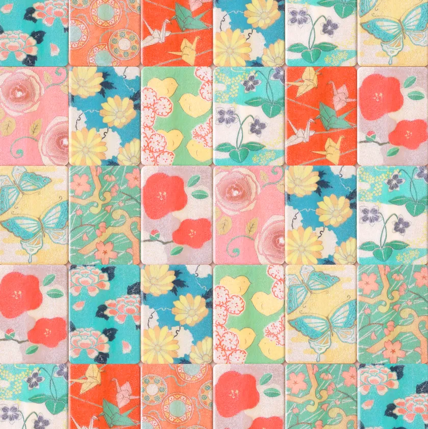厚さ3mmの最中種(最中の皮)に、日本古来の文様をベースにオリジナルで書き下ろしたイラストを精密にプリントいたしました。色とりどりの柄は、「文様や色合いに想いを込めて贈る」日本ならではの奥ゆかしい文化を表現しています。また、それぞれの絵柄にはハート形が隠されており、想いを届けるバレンタインにぴったりの可愛らしい商品に仕上げました。