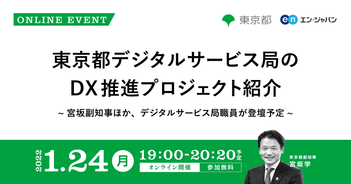 人材採用・入社後活躍のエン・ジャパン株式会社(本社:東京都新宿区、代表取締役社長:鈴木孝二)は、2022年1月6日(木)から東京都の「デジタルシフト推進担当課長」の採用支援をスタートします。社会的インパクトが大きい人材採用を支援する「ソーシャルインパクト採用プロジェクト」の一環として、当社が運営する採用支援サービスを通じて人材を公募。下記、本プロジェクトの概要と東京都副知事 宮坂学氏のコメントを紹介します。ぜひ、ご一読ください。