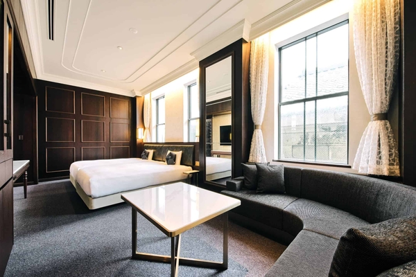 当ホテルが位置しているのは、多くの歴史的建造物が並ぶ「北のウォール街」と呼ばれるエリアで、小樽観光の拠点に適した場所です。小樽市指定歴史的建造物の「旧小樽商工会議所」をリノベーションした南館、機能性とデザインを追求した北館の2館で構成されています。南館には、旧小樽商工会議所で使われていた階段はそのまま残し、棚や鏡台などもインテリアとして館内に配置しました。北館にあるOMOベースでも、旧小樽商工会議所で使用していた消火栓や鍵を装飾として取り入れました。館内でさまざまなレトロなインテリアを見つけるのも楽しみのひとつです。