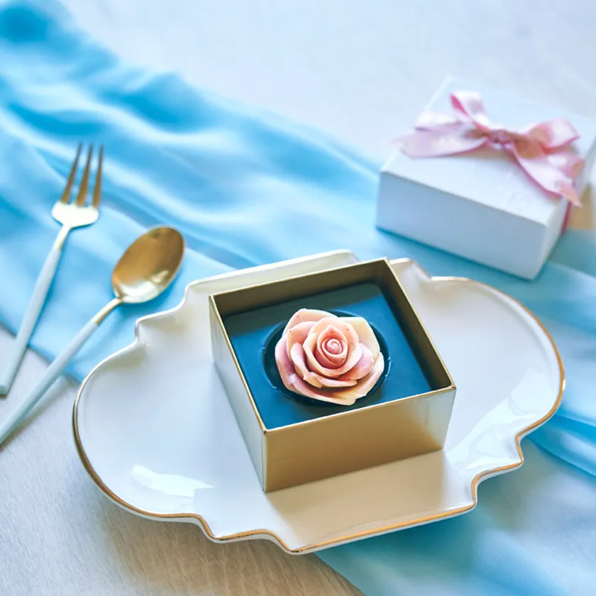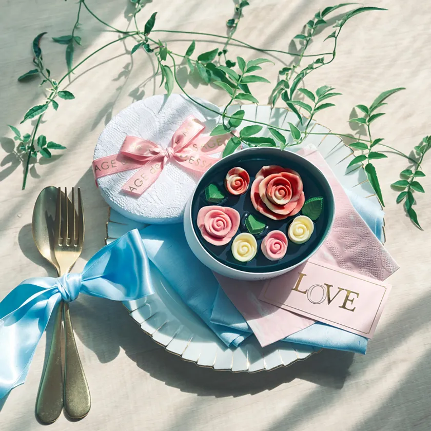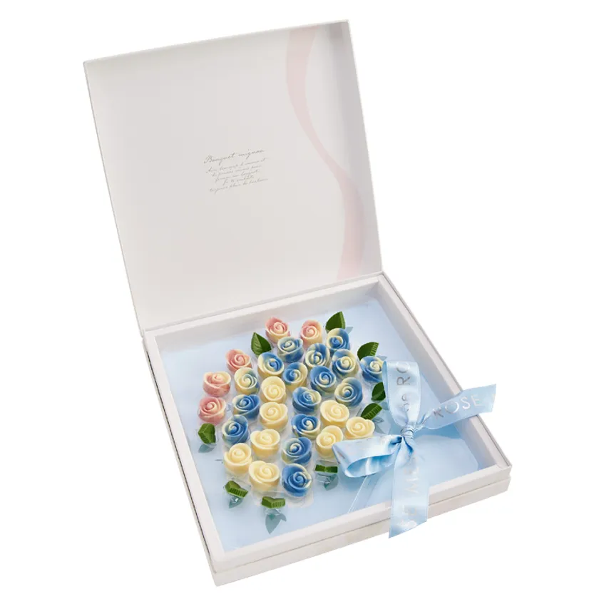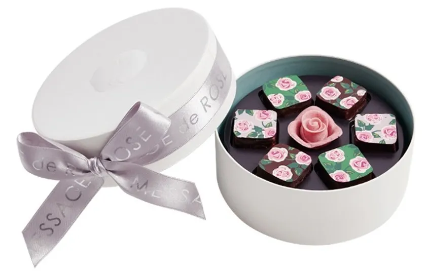 薔薇のつぼみのショコラでつくったフラワーボックス。イチゴ、ミルク、ホワイト、ラズベリー&ホワイトマーブル、4つの味がお楽しみいただけます。