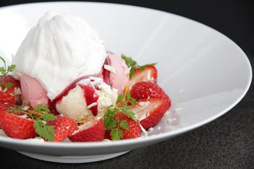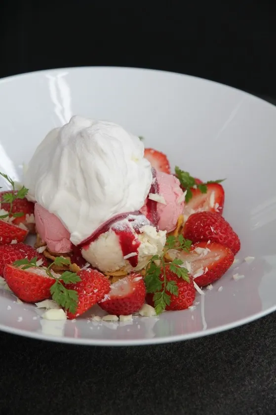 旬の完熟いちごをたっぷりと使い、ホイップクリームやアイスクリーム、ラズベリーのソースホワイトチョコでいちごを美味しく引き立てます。