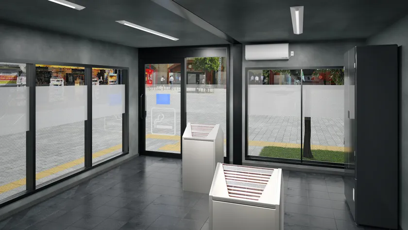 「コンテナ型喫煙所 新橋駅前SL広場」は、利用者が多い立地であることを踏まえ、当社で初めて20Ftコンテナを2基連結して製造することで広い室内空間を実現しました。柱をつなぐ梁が少ない状態で建物としての強度を維持し、喫煙所内に柱のない広い空間を確保しています。喫煙室の広さは約30m2と、コンテナ型喫煙所としては国内最大規模となります。また、今回導入した「喫煙コンテナ」は、通常の「喫煙コンテナ」と比べ、よりバリアフリーに特化した設計になっており、出入口下部の梁を無くすことで床面を下げ、長いスロープを設けることなくバリアフリーを実現しました。