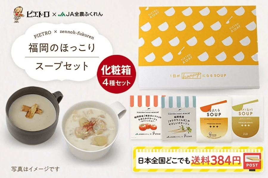 JA全農が運営する産地直送通販サイト「JAタウン」のショップ「博多うまかショップ」は、「株式会社ピエトロ」のスープを詰め合わせた、JAタウン限定の新しいギフト商品販売を記念して、11月12日(水)から11月30日(日)まで、「冬はピエトロスープであったかキャンペーン」を実施します。