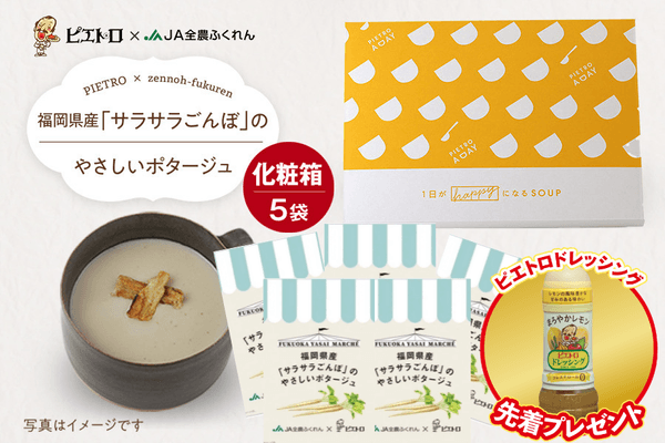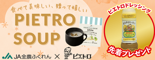 今回のキャンペーンでは、「福岡県の美味しいをもっと広めたい!」という想いのもと、「株式会社ピエトロ」と「JA全農ふくれん」、「農林中央金庫」の3者が協業し開発したポタージュ等を詰め合わせた、新しいギフト商品を販売します。販売開始を記念して、対象商品を購入いただいた方、先着30名様に「ピエトロドレッシング まろやかレモン」をプレゼントします。