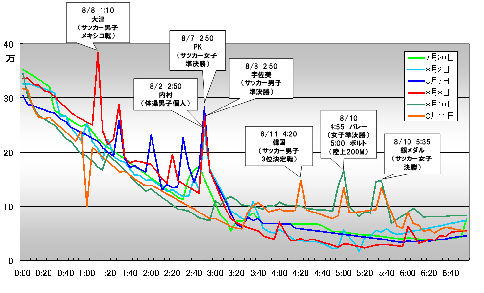 0時から7時までの国内ツイート数が1,000万件を超えたのは、7月30日、8月2日、7日、8日、10日、11日の6日間。うち5日間はサッカーの試合が行われました。