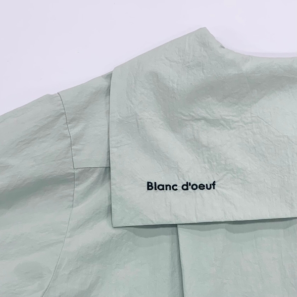 衿に入っているブランドロゴの刺繍と、ボタンを配色にすることでアクセントにしました。