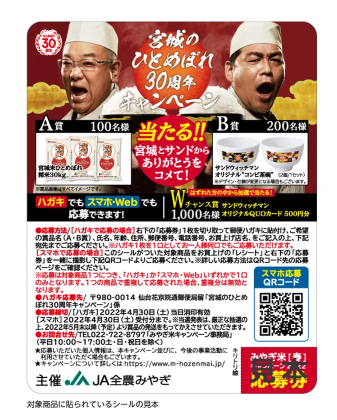 【ここでしか手に入らない】 JA全農みやぎ×サンドウィッチマン 限定コラボグッズプレゼント! 『宮城のひとめぼれ30周年キャンペーン』開催