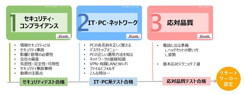 リモートワーカー認定では、在宅勤務を実施するために必要な「セキュリティ・コンプライアンス」「IT・PC・ネットワーク」「応対品質」の3つの講座があります。これらの講座を受講し、テストに合格することで「リモート―ワーカー」として認定され、安心して勤務を開始していただくことができます。