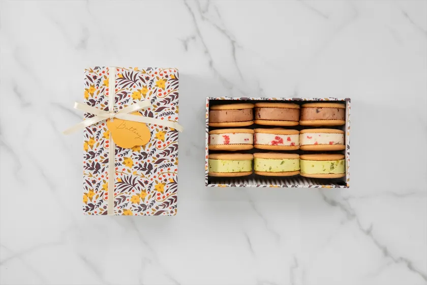 国産発酵バターを使用したサクサク食感のクッキーに、バタークリームをたっぷりと挟んだ「バタリーサンド」には、チョコレートの新フレーバーが登場。フリーズドライストロベリーの酸味と食感が楽しめる「ホワイトチョコ苺」と、甘さ控えめのダークチョコレートで大人な味わいに仕上げた「チョコレート」の新作2種類に、お客様からの人気も高い「ピスタチオ」を詰め合わせました。