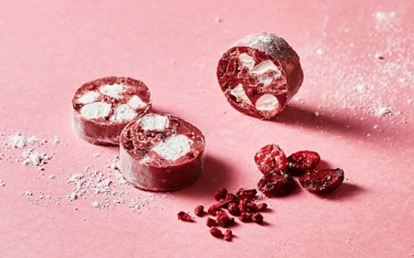 ルビーチョコレートをベースに、フランボワーズチョコレート、ストロベリーチョコレート、ジャンドゥーヤの4種を独自の黄金比率でバランスよくブレンド。クランベリー、フランボワーズの酸味とマシュマロの食感をお楽しみください。