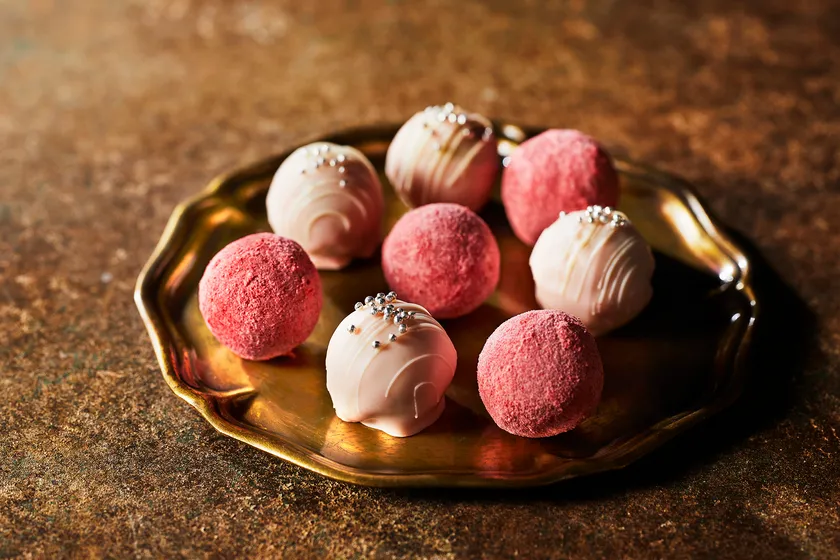 すっきりとした甘さのフランス産ホワイトチョコレートと生クリームに、パウダー状にしたフリーズドライ苺を混ぜ合わせた口溶けのよいガナッシュをホワイトチョコレートで包み、苺のパウダーでコーティングした甘みと酸味のバランスのよいトリュフです。