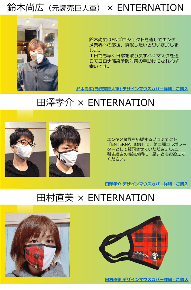 このような現実に打開策を講じて、コロナ禍で未だ先行きの見えないエンタメ業界を応援するために立ち上げたプロジェクトです。イベント、ライブ、コンサート再開に向けて、オリジナルグッズの製作販売及び、様々なジャンルの著名人の方々とコラボレーショングッズを製作販売し、この収益金(製造費や送料及び諸経費を除く)を、今後再開予定の活動等における、感染防止対策費用の資金としてお使いいただける企画です。また、同時に収益金の一部をENTERNATION基金としてもデポジットさせていただき、厳正なる審査で寄贈先を選定の上、感染防止アイテムを寄贈してまいります。ここでしか買えない様々なコラボレーターのグッズをご購入いただくことで、ライブエンタメ業界を応援してください。今後も様々なコラボグッズを製作していく予定ですので、随時コラボレーターも募集しております。