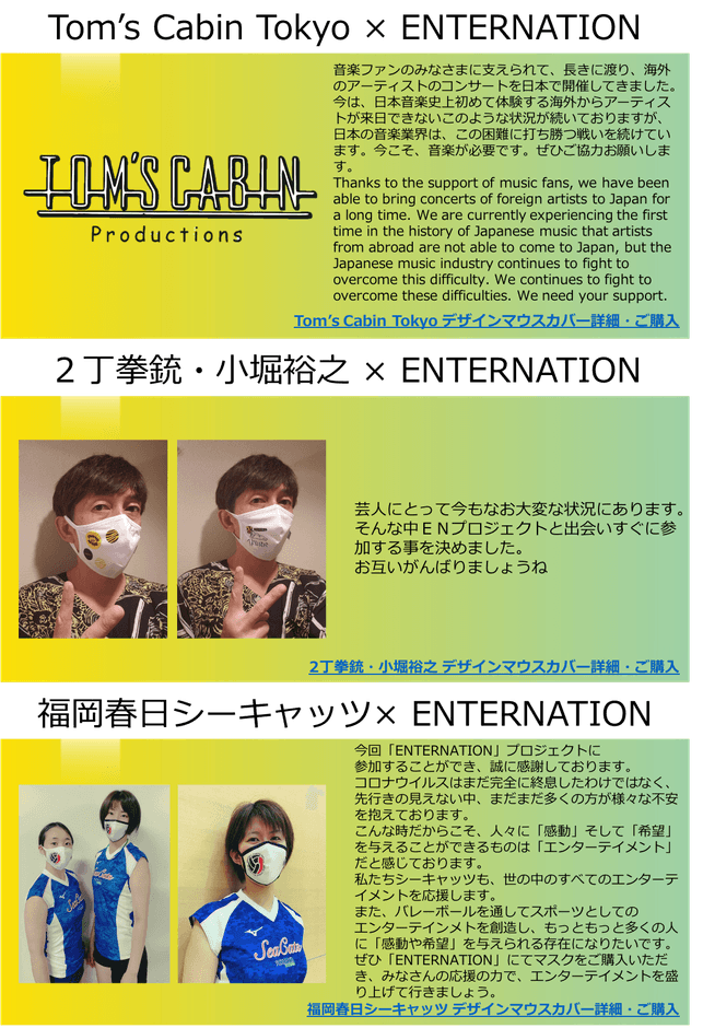 株式会社ハイウェイプラネットとハイファイブ株式会社(代表者:久島信耶/所在地:東京都千代田区)は、コロナ禍の中、エンタメ業界を応援するためのプロジェクト “ENTERNATION” を始動し、ウィズコロナ時代への感染予防啓発アイテムとしてコラボレーターとのコラボレーションマウスカバーを販売いたしました。