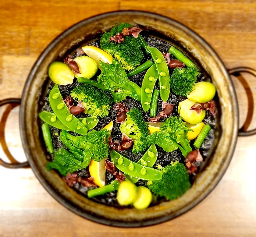 ■『ホタルイカと春野菜のイカスミパエリア』について