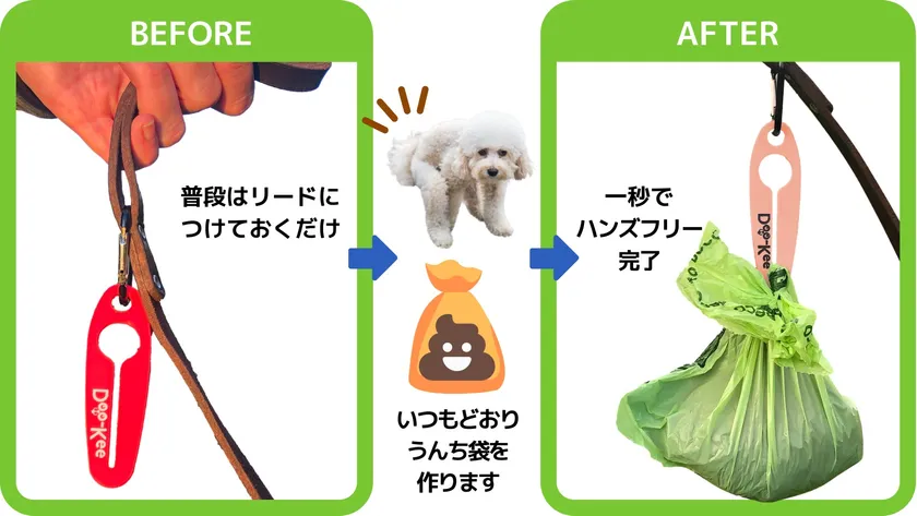 現在約850万頭(令和2年12月時点)いるといわれているペットの犬。かわいがり方は人それぞれですが、昔から変わらないのは散歩中の愛犬のフンの持ち帰り方法と、その憂鬱でした。汚物を手に持つ・バッグやポーチに入れて『仕方ない』とあきらめていたのを、たった一秒でハンズフリーで簡単に運べます。うんちの憂鬱から解放されて、もっと楽チンに、愛犬と楽しんでほしいとの思いから取り扱いに至りました。